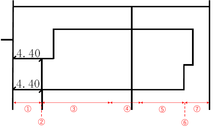 ① 4.40m … 西側の筆界から建物の「外壁」までの距離